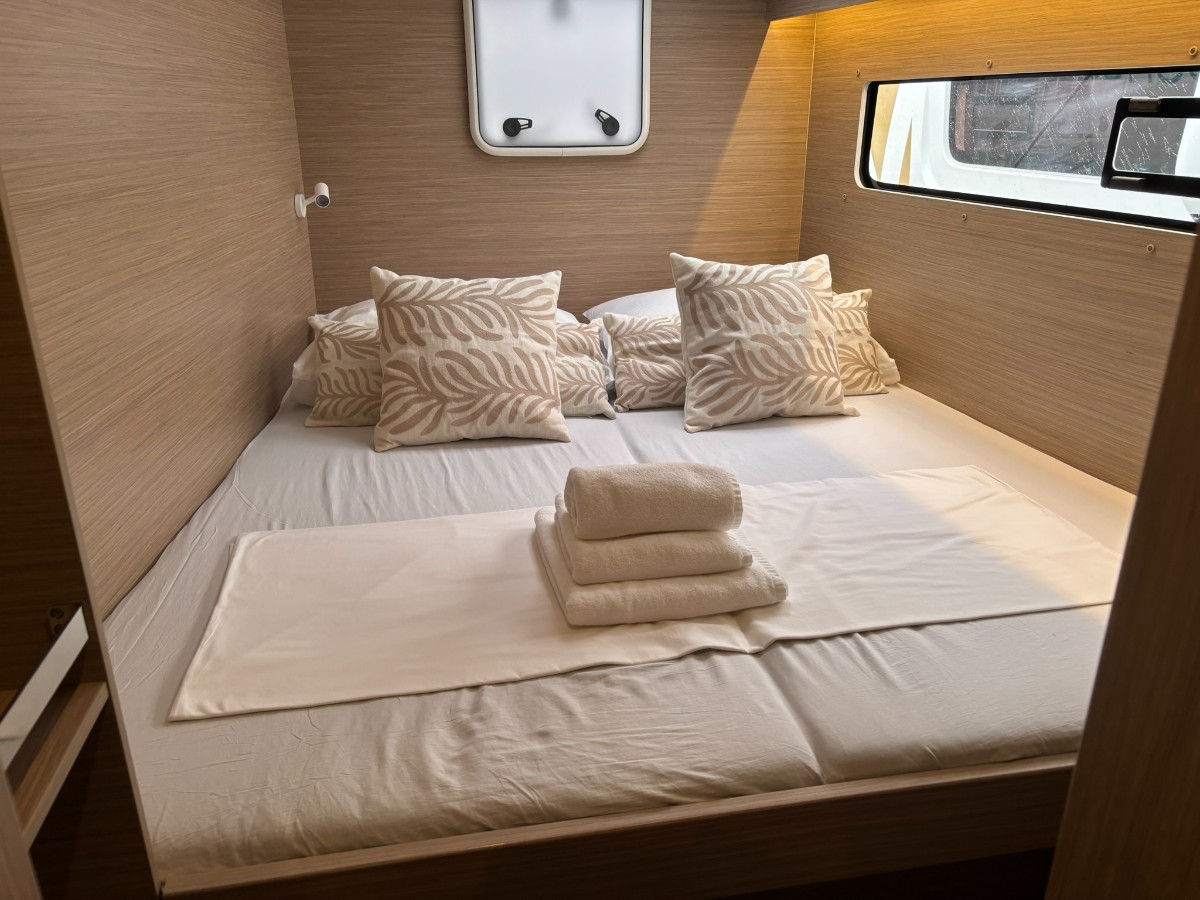Nella maggior parte delle barche prevale il layout 4 cabine + 2 bagni, ma esistono anche versioni a 3 cabine (a seconda della flotta e della versione). In alcune destinazioni si trovano configurazioni con più bagni, ma nella pratica charter vedrai soprattutto versioni 4+2 o 3+2.