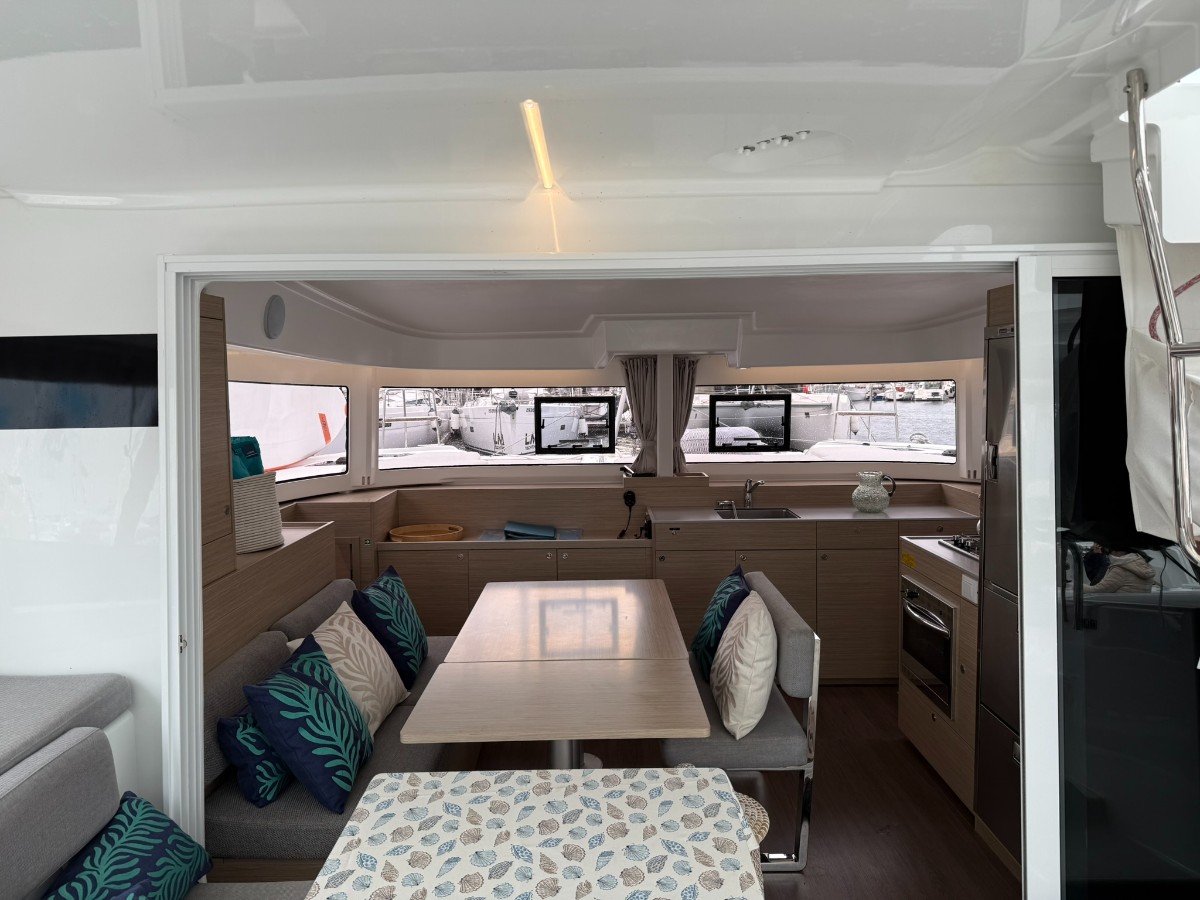 Sul Lagoon 38, pozzetto e dinette formano un’unica grande zona living, separata da una parete vetrata. È il tipico “Lagoon feel”: tanta luce, tante sedute e uno spazio che in charter si usa tutto il giorno.