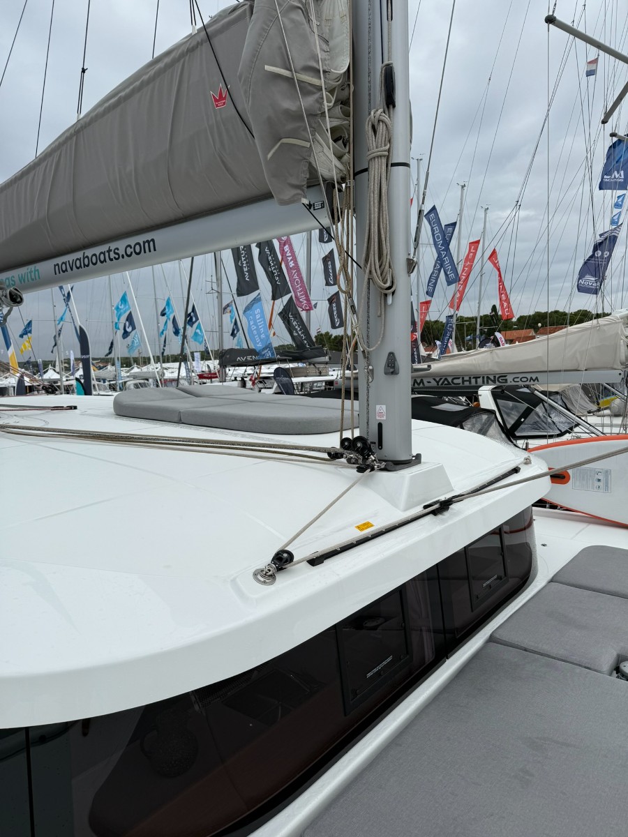 È anche il più largo: 6,65 m – leggermente più largo dell’Excess 11 (6,59 m), sensibilmente più largo del CatSmart (6,46 m) e soprattutto dell’Aventura 37 (5,94 m).