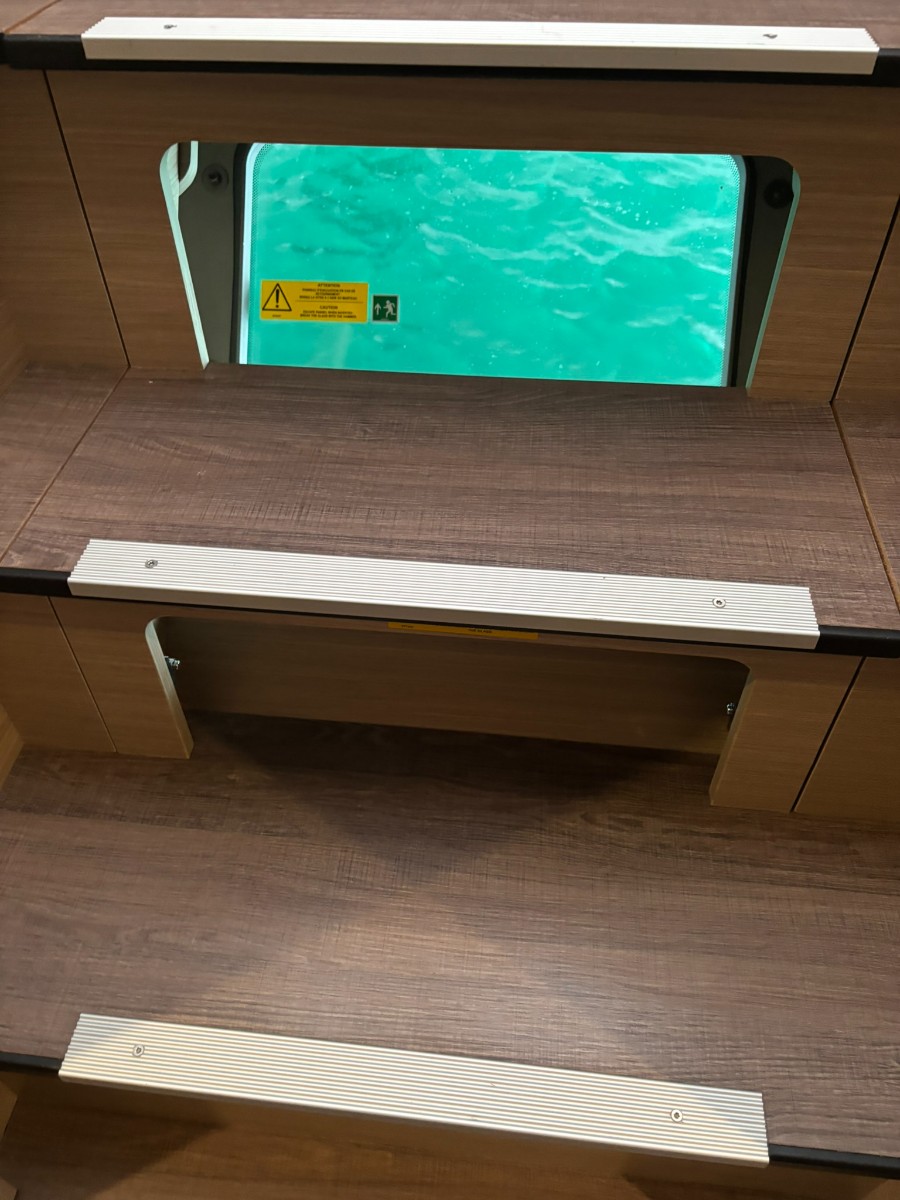 Un dettaglio molto apprezzato dagli ospiti: le porte laterali sugli scafi facilitano l’ingresso e l’uscita, soprattutto quando si è ormeggiati lateralmente o quando il molo/ristorante è più alto della barca. Più sicuro e più semplice – senza “acrobazie” sopra la ringhiera.