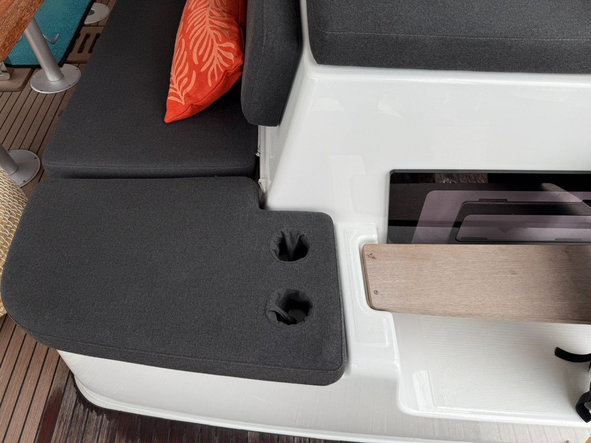 La combinazione di cockpit e salone crea un ampio spazio comune per i pasti e per socializzare, mentre il flybridge lounge aggiunge un altro “salotto” all’aperto. Ciò significa che più persone possono distribuiti sulla barca senza sentirsi affollati – qualcuno mangia, qualcuno si riposa, qualcun altro si gode il ponte.